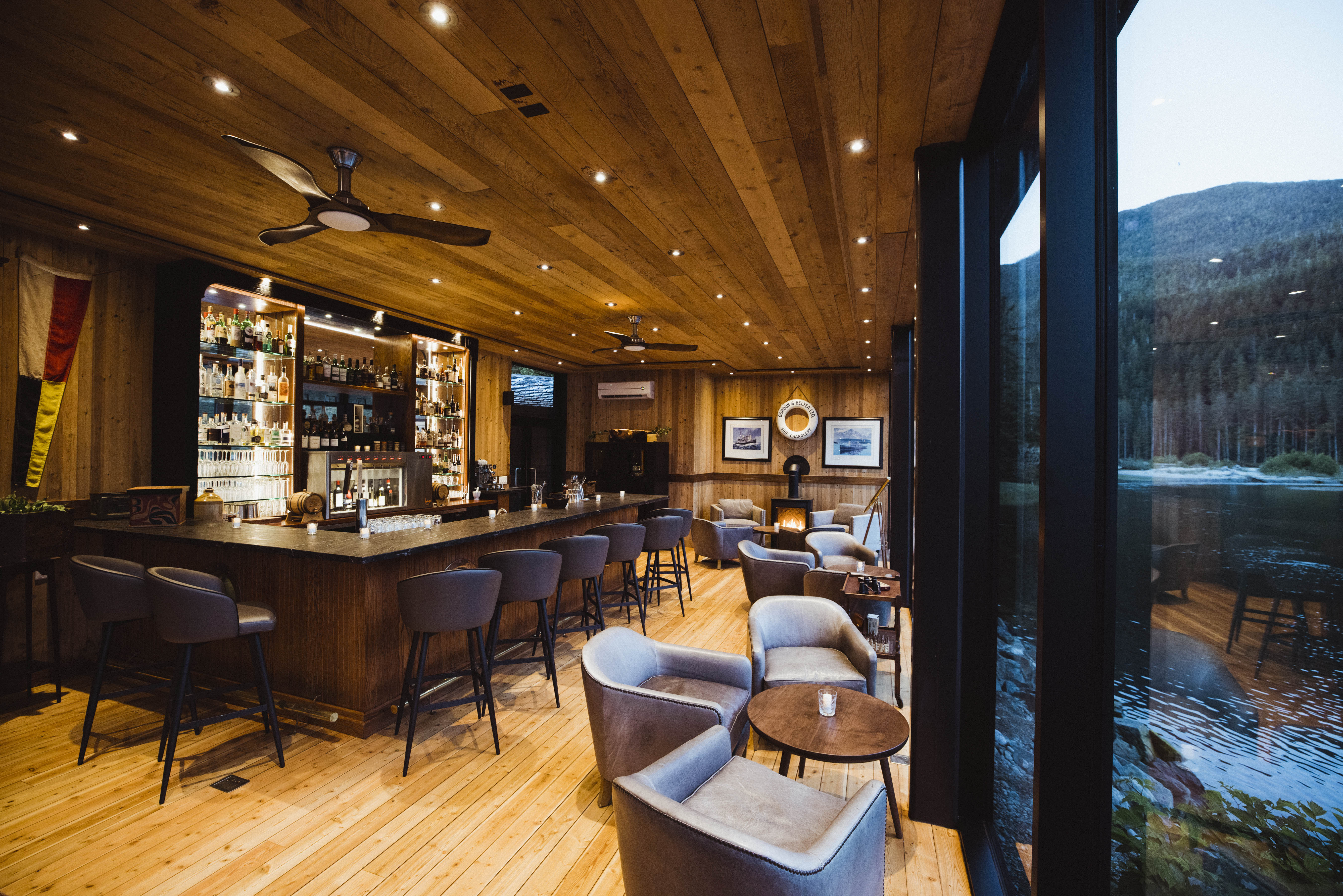 Reaching eleven feet, floor-to-ceiling glass windows deliver mesmerising views of Clayoquot Sound, making The Ivanhoe the best place to enjoy a drink and watch the weather and wildlife in action. Upstairs, a rooftop lounge looks straight down to the bottom of the emerald green Bedwell River, while outside a firepit and cedar deck chairs invite lounging well into the evening.