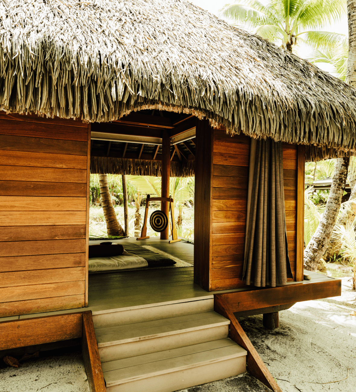 Just up a few steps off the sand lies Fare Mana, where the setting is a simple platform, covered from the sun and rain, yet open to the holistic healing powers of the nature and water that surrounds you.